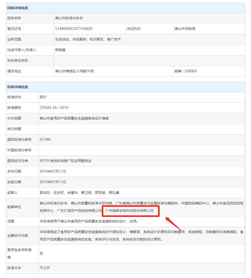 瑞森生物參與制定的T/FSAS 36—2019 《佛山市食用農(nóng)產(chǎn)品質(zhì)量安全追溯系統(tǒng)設(shè)計指南》團體標(biāo)準(zhǔn)于2019年7月11日在全國團體標(biāo)準(zhǔn)信息平臺發(fā)布公示。