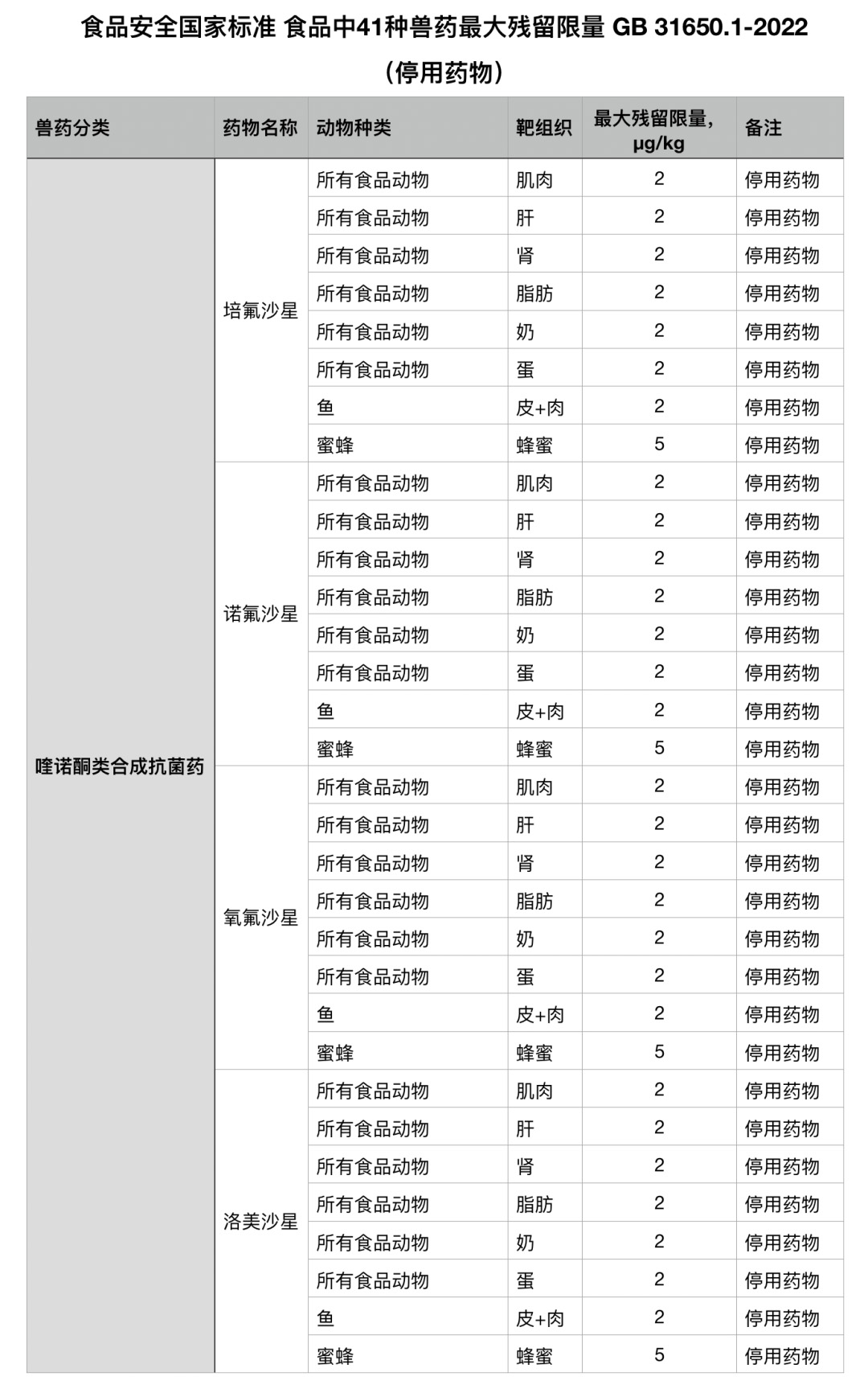 關于靶組織為“蜂蜜”的標準4項,增加停用藥物限量(氧氟沙星5μg/kg、諾氟沙星5 μg/kg、培氟沙星5 μg/kg和洛美沙星5 μg/kg)。