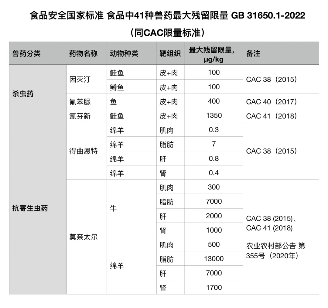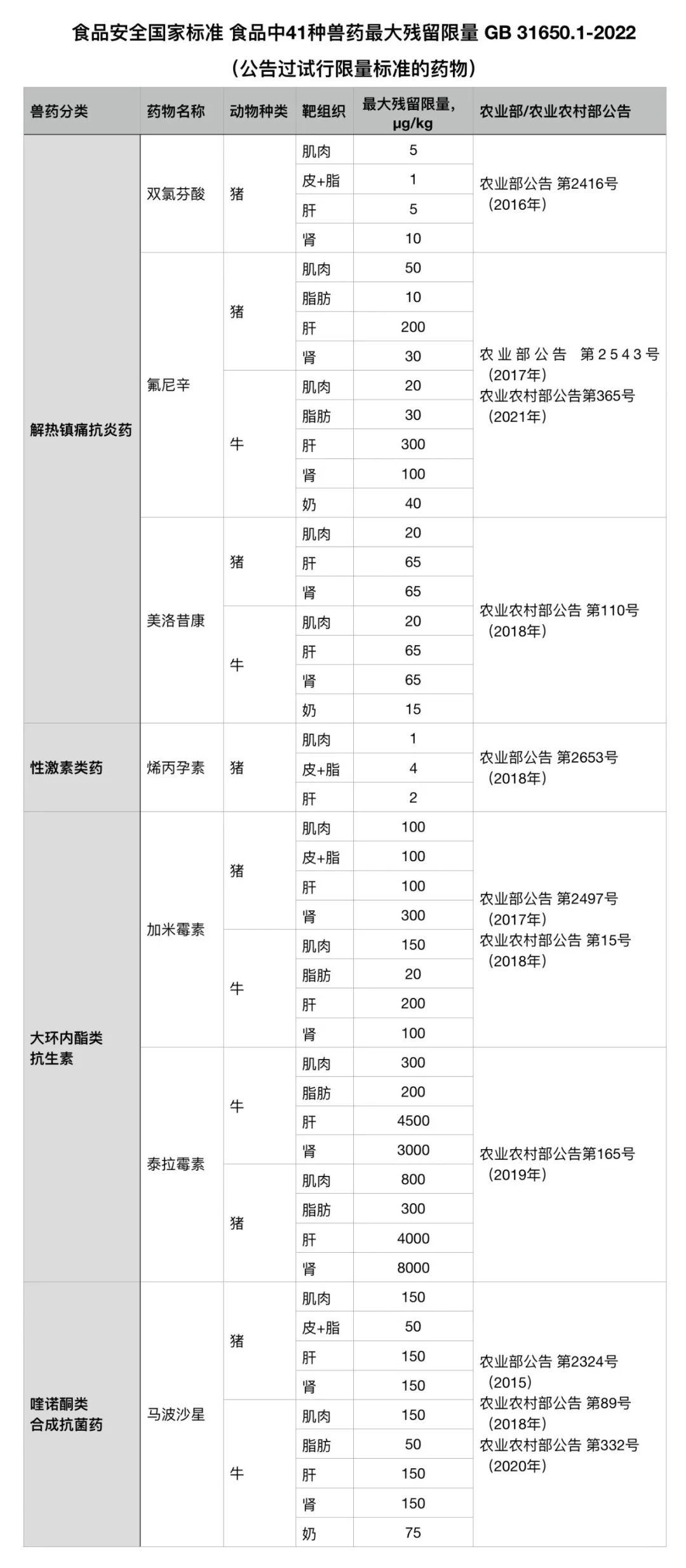 《食品安全國家標準 食品中41種獸藥最大殘留限量》(GB 31650.1-2022),41種在動物性食品中增修訂限量標準的藥物,主要為以下四種情況: