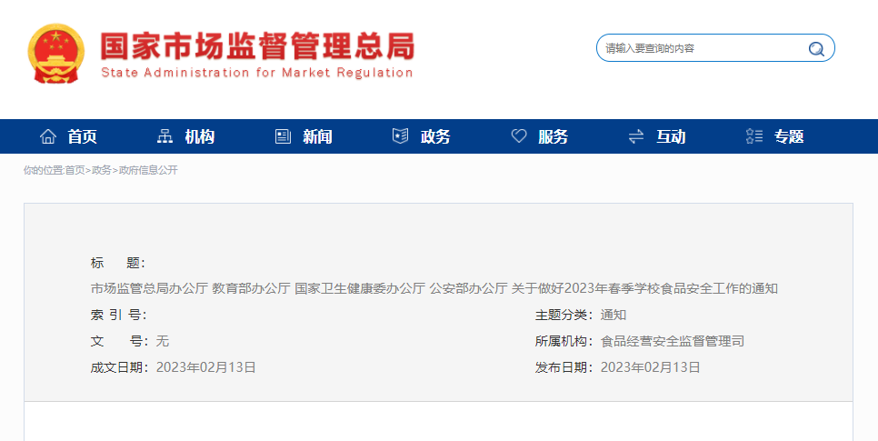 各省、自治區(qū)、直轄市和新疆生產(chǎn)建設(shè)兵團(tuán)市場監(jiān)管局(廳、委)、教育廳(教委、教育局)、衛(wèi)生健康委、公安廳(局): 為有序推進(jìn)2023年春季學(xué)期學(xué)校和幼兒園(以下統(tǒng)稱學(xué)校)食品安全監(jiān)管工作,全力保障廣大師生“舌尖上的安全”,現(xiàn)就有關(guān)事項(xiàng)通知如下: 一、全心守護(hù),壓實(shí)落細(xì)“兩個責(zé)任”。各地有關(guān)部門要堅(jiān)決落實(shí)食品安全“四個最嚴(yán)”要求,按照《中華人民共和國食品安全法》《學(xué)校食品安全與營養(yǎng)健康管理規(guī)定》《關(guān)于落實(shí)主體責(zé)任強(qiáng)化校園食品安全管理的指導(dǎo)意見》等有關(guān)文件要求,依職責(zé)強(qiáng)化學(xué)校食品安全管理,持續(xù)推進(jìn)校園食品安全守護(hù)行動,壓緊壓實(shí)屬地監(jiān)管責(zé)任,完善末端發(fā)力、終端見效的制度機(jī)制。各地市場監(jiān)管部門要指導(dǎo)校外供餐單位和學(xué)校食堂按照《企業(yè)落實(shí)食品安全主體責(zé)任監(jiān)督管理規(guī)定》有關(guān)要求,依法配備食品安全總監(jiān)和食品安全員。各地教育部門要督促學(xué)校和幼兒園落實(shí)食品安全校長(園長)負(fù)責(zé)制和相關(guān)負(fù)責(zé)人陪餐制度。各地市場監(jiān)管、教育部門要指導(dǎo)校外供餐單位和學(xué)校食堂在開學(xué)前全面開展食品安全自查,加大對因受新冠疫情影響、較長時間停止餐食供應(yīng)的校外供餐單位和學(xué)校食堂的指導(dǎo)檢查力度,及時防范化解食品安全隱患。 二、全程嚴(yán)控,規(guī)范加工制作過程。各地市場監(jiān)管、教育部門要督促校外供餐單位和學(xué)校食堂按照《食品安全國家標(biāo)準(zhǔn) 餐飲服務(wù)通用衛(wèi)生規(guī)范》(GB31654—2021)和《餐飲服務(wù)食品安全操作規(guī)范》等要求,嚴(yán)格執(zhí)行索證索票、進(jìn)貨查驗(yàn)、從業(yè)人員健康管理、食品留樣等制度,強(qiáng)化食品采購、貯存、加工、配送和餐飲具清洗消毒等各環(huán)節(jié)管理,嚴(yán)控食品安全風(fēng)險(xiǎn)。各地教育部門要會同有關(guān)部門指導(dǎo)學(xué)校設(shè)定招標(biāo)門檻、實(shí)行大宗食品公開招標(biāo)、集中定點(diǎn)采購,嚴(yán)格履行招標(biāo)程序,及時公布中標(biāo)的校外供餐單位名單,建立健全校外供餐單位引進(jìn)和退出機(jī)制。 三、全覆蓋檢查,加大監(jiān)督整改力度。各地市場監(jiān)管部門要會同教育部門進(jìn)一步加大監(jiān)督檢查力度,加強(qiáng)公正文明執(zhí)法,綜合運(yùn)用說服教育、勸導(dǎo)示范、警示告誡、指導(dǎo)約談、行政處罰等方式,依法依規(guī)查處食品安全違法違規(guī)行為,對檢查中發(fā)現(xiàn)的食品安全問題和隱患督促限期整改到位。嚴(yán)格執(zhí)行《中華人民共和國未成年人保護(hù)法》對學(xué)校周邊不得設(shè)置售煙、售酒網(wǎng)點(diǎn)及禁止向未成年人售煙、售酒的規(guī)定,嚴(yán)肅查處學(xué)校及周邊、網(wǎng)絡(luò)平臺等面向未成年人無底線營銷食品等違法違規(guī)行為。各地教育部門要督促中小學(xué)校、幼兒園原則上不在校內(nèi)設(shè)置小賣部、超市,確需設(shè)置的,不宜售賣高鹽、高糖及高脂食品。各地公安機(jī)關(guān)要及時受理、依法立案偵查涉嫌犯罪的食品安全案件,依法嚴(yán)厲打擊學(xué)校及周邊、網(wǎng)絡(luò)平臺食品安全違法犯罪行為。 四、全力以赴,制止餐飲浪費(fèi)行為。各地市場監(jiān)管、教育部門要督促校外供餐單位和學(xué)校食堂對照《中華人民共和國反食品浪費(fèi)法》開展自查自糾,建立并實(shí)施反食品浪費(fèi)管理制度,將防止食品浪費(fèi)理念納入供餐食譜設(shè)計(jì),按照用餐人數(shù)和營養(yǎng)均衡的原則配置菜品、主食,加強(qiáng)食品在采購、儲存、加工、發(fā)放等環(huán)節(jié)的減損管理。各地教育部門要指導(dǎo)學(xué)校深入開展反食品浪費(fèi)宣傳教育,培養(yǎng)學(xué)生養(yǎng)成勤儉節(jié)約、珍惜糧食的文明用餐習(xí)慣,踐行“光盤行動”;指導(dǎo)學(xué)校建立防止食品浪費(fèi)的監(jiān)督檢查機(jī)制。 五、全面普及,提高師生健康素養(yǎng)。各地教育部門要會同市場監(jiān)管、衛(wèi)生健康部門為學(xué)校提供食品安全和營養(yǎng)健康指導(dǎo),加強(qiáng)學(xué)校相關(guān)工作人員培訓(xùn),創(chuàng)新培訓(xùn)形式,拓寬培訓(xùn)渠道,為學(xué)生普及食源性疾病預(yù)防和平衡膳食的知識技能。各地教育部門要鼓勵、指導(dǎo)有條件的學(xué)校配備營養(yǎng)指導(dǎo)員,發(fā)揮專業(yè)人員作用,根據(jù)學(xué)生年齡和生長發(fā)育特點(diǎn),提供均衡營養(yǎng)膳食,倡導(dǎo)學(xué)生餐食減油、減鹽、減糖;鼓勵學(xué)校創(chuàng)建營養(yǎng)健康食堂,公布學(xué)生餐帶量食譜和營養(yǎng)成分;引導(dǎo)學(xué)生養(yǎng)成勤洗手、常喝水、多通風(fēng)、勤鍛煉、注意咳嗽禮儀等良好生活習(xí)慣。 六、全民參與,提升智慧監(jiān)管效能。各地市場監(jiān)管、教育部門要持續(xù)推進(jìn)校外供餐單位和學(xué)校食堂“互聯(lián)網(wǎng)+明廚亮灶”提質(zhì)擴(kuò)面,加快智慧監(jiān)管賦能,提升學(xué)校食品安全管理