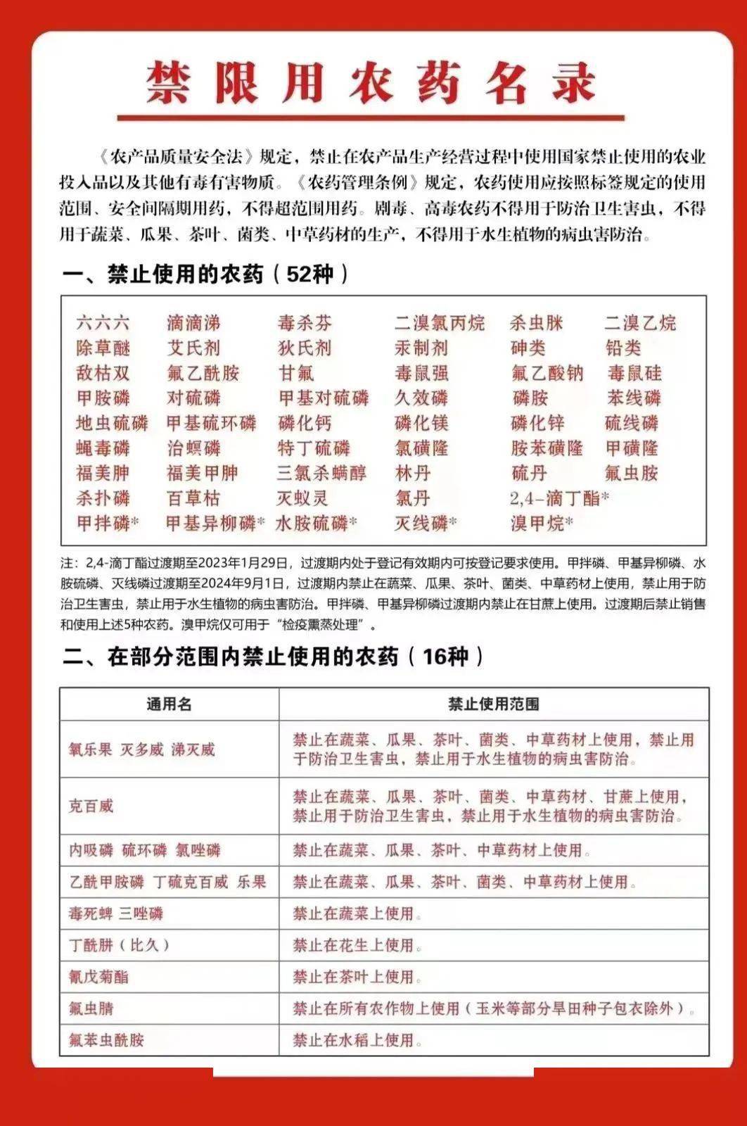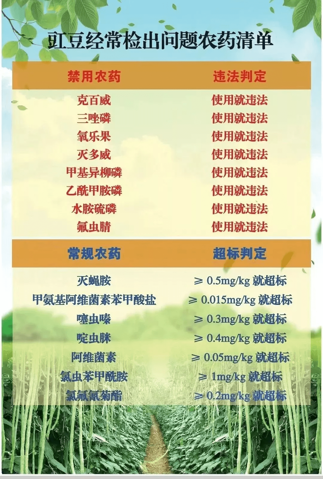 豇豆,別名“長豆角”、“長豆子”、“豆角”。近年來,豇豆由于病蟲害多發(fā)重發(fā)、用藥頻繁,花果同期,采摘間隔短,加之豇豆以小農(nóng)戶分散種值為主,連續(xù)多年監(jiān)測合格率偏低,禁用農(nóng)藥檢出和常規(guī)農(nóng)藥殘留超標時有發(fā)生。為保障“菜籃子”產(chǎn)品質(zhì)量安全,農(nóng)業(yè)農(nóng)村部發(fā)布《食用農(nóng)產(chǎn)品“治違禁 控藥殘 促提升”三年行動方案》內(nèi)容中提到,把豇豆列入重點整治品種,在全國開展豇豆農(nóng)藥殘留突出問題攻堅治理。 另外,《農(nóng)產(chǎn)品質(zhì)量安全法》規(guī)定,禁止在農(nóng)產(chǎn)品生產(chǎn)經(jīng)營過程中使用國家禁止使用的農(nóng)業(yè)投入品以及其他有毒有害物質(zhì)?!掇r(nóng)藥管理條例》規(guī)定,農(nóng)藥使用應(yīng)按照標簽規(guī)定的使用范圍、安全間隔期用藥,不得超范圍用藥。劇毒、高毒農(nóng)藥不得用于防治衛(wèi)生害蟲,不得用于蔬菜、瓜果、茶葉、菌類、中草藥材的生產(chǎn),不得用于水生植物的病蟲害防治。一、農(nóng)產(chǎn)品禁限用農(nóng)藥名錄二、豇豆經(jīng)常檢出問題農(nóng)藥清單