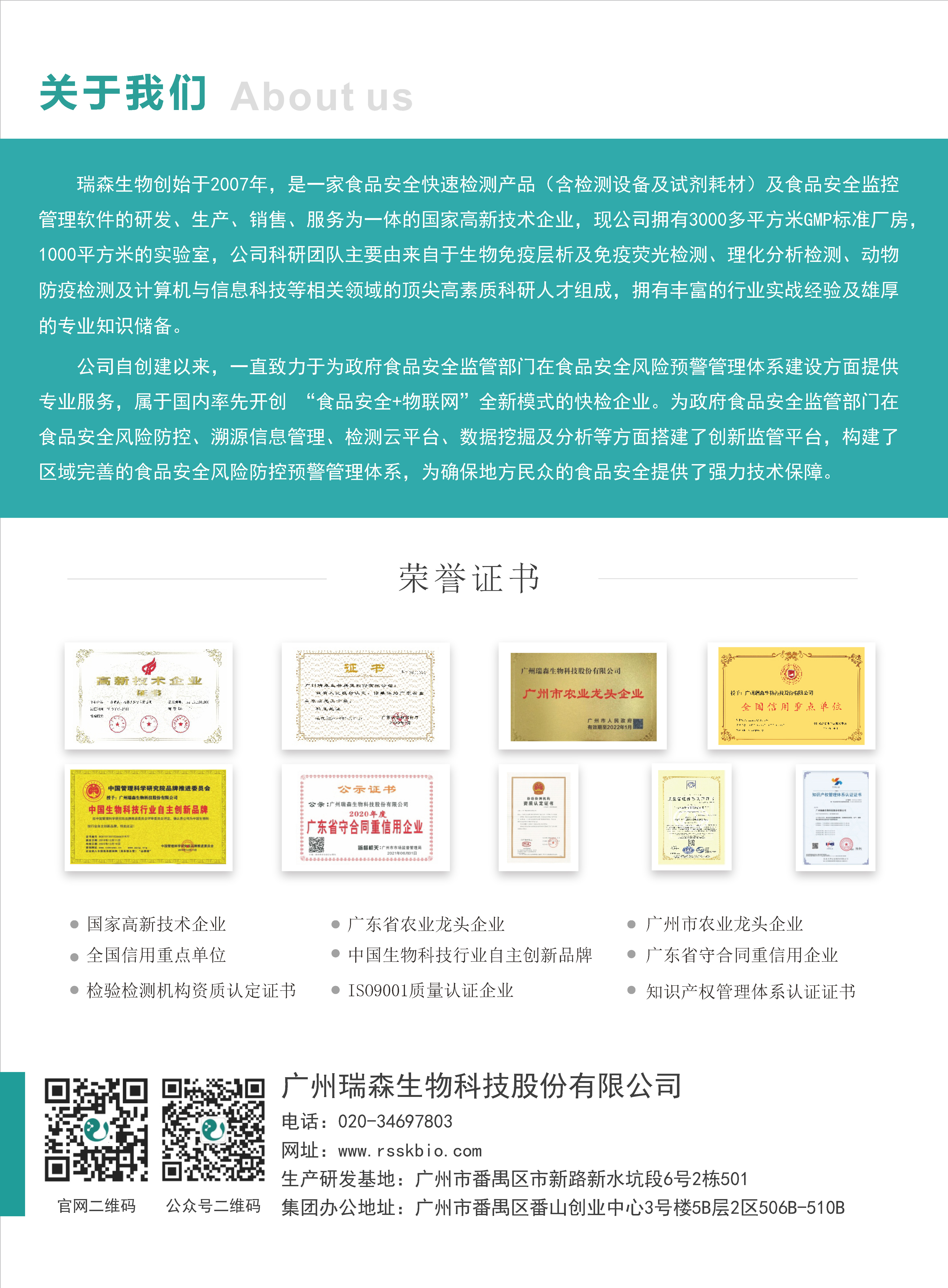 瑞森生物作為廣東省重點農(nóng)業(yè)龍頭企業(yè),一直致力于食品安全檢測行業(yè),至今已深耕十六年之久。公司在食品安全檢測領(lǐng)域發(fā)揮了技術(shù)優(yōu)勢,憑借精湛的技術(shù)為客戶提供優(yōu)質(zhì)、穩(wěn)定、可靠的產(chǎn)品,為國人食品安全保駕護航,也為推動食品檢測行業(yè)高質(zhì)量發(fā)展貢獻了企業(yè)力量。公司屬國家高新技術(shù)企業(yè),廣東省重點農(nóng)業(yè)龍頭企業(yè),廣州市農(nóng)業(yè)龍頭企業(yè),全國重點信用單位,廣東省守合同重信用企業(yè),中國生物科技行業(yè)自主創(chuàng)新品牌企業(yè),目前擁有國家專利29項,國家軟件著作權(quán)18項,高新技術(shù)產(chǎn)品15項,技術(shù)項目研發(fā)5項。公司現(xiàn)擁有快速檢測試劑和設(shè)備上百種,核心產(chǎn)品通過農(nóng)業(yè)農(nóng)村部驗證,可為監(jiān)管部門、農(nóng)牧企業(yè)、經(jīng)銷商提供專業(yè)、全面的檢測產(chǎn)品和服務(wù)。