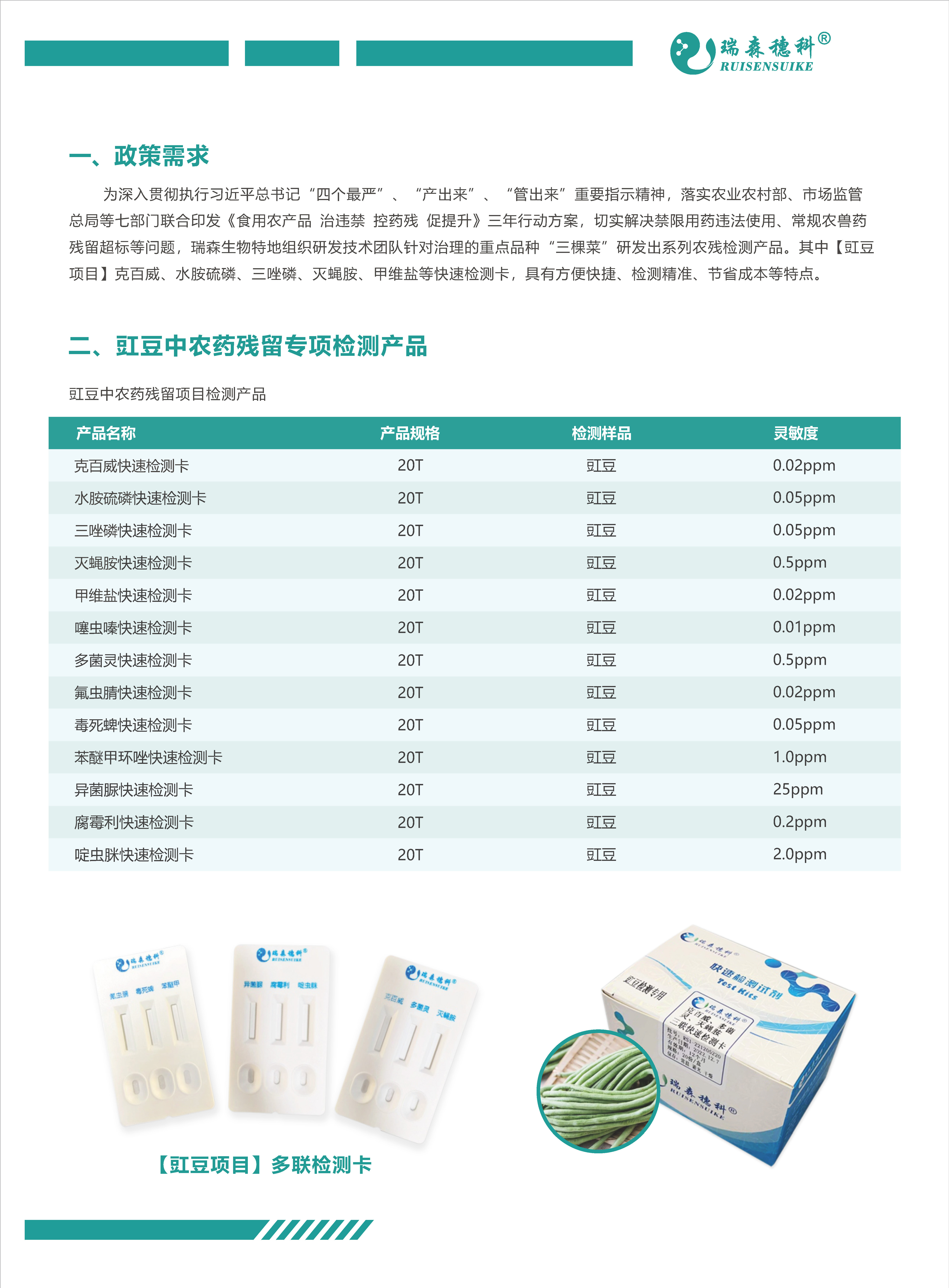 瑞森生物認真學(xué)習(xí)和貫徹國家《農(nóng)產(chǎn)品質(zhì)量安全法》,積極擁護和響應(yīng)農(nóng)業(yè)農(nóng)村部《食用農(nóng)產(chǎn)品“治違禁 控藥殘 促提升”三年行動方案》文件精神。針對《方案》中提到的需要重點治理的“豇豆”農(nóng)產(chǎn)品,瑞森生物推出了“豇豆藥殘專項檢測解決方案”,有效解決了豇豆中農(nóng)藥殘留的相關(guān)問題。