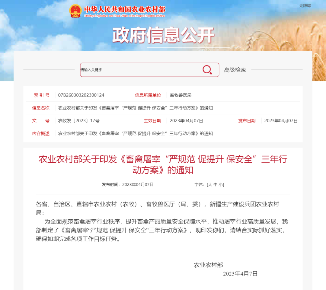 為貫徹落實(shí)《中華人民共和國(guó)畜牧法》、《中華人民共和國(guó)動(dòng)物防疫法》、《中華人民共和國(guó)農(nóng)產(chǎn)品質(zhì)量安全法》和《生豬屠宰管理?xiàng)l例》,以及《國(guó)務(wù)院辦公廳關(guān)于促進(jìn)畜牧業(yè)高質(zhì)量發(fā)展的意見(jiàn)》有關(guān)要求,全面規(guī)范畜禽屠宰行業(yè)秩序,提升畜禽產(chǎn)品質(zhì)量安全保障水平,推動(dòng)屠宰行業(yè)高質(zhì)量發(fā)展,我部決定實(shí)施畜禽屠宰“嚴(yán)規(guī)范 促提升 保安全”三年行動(dòng)。具體方案如下。通過(guò)實(shí)施三年行動(dòng),到2025年,全國(guó)畜禽屠宰布局結(jié)構(gòu)進(jìn)一步優(yōu)化,屠宰產(chǎn)能向養(yǎng)殖主產(chǎn)區(qū)集聚,與養(yǎng)殖產(chǎn)能匹配度明顯提高;落后產(chǎn)能有序壓減,牛羊禽集中屠宰扎實(shí)推進(jìn),畜禽屠宰產(chǎn)能利用率和行業(yè)集中度穩(wěn)步提高,畜禽屠宰規(guī)范化機(jī)械化智能化水平明顯提升;生豬屠宰企業(yè)全部實(shí)施屠宰質(zhì)量管理規(guī)范(以下簡(jiǎn)稱(chēng)“屠宰GMP”),部級(jí)生豬屠宰標(biāo)準(zhǔn)化建設(shè)示范單位達(dá)200家以上,其他畜禽屠宰標(biāo)準(zhǔn)化創(chuàng)建穩(wěn)步開(kāi)展;畜禽屠宰法規(guī)標(biāo)準(zhǔn)體系進(jìn)一步完善,監(jiān)管能力和水平進(jìn)一步提升,屠宰環(huán)節(jié)畜禽產(chǎn)品質(zhì)量安全得到有效保障。(一)加強(qiáng)法規(guī)制度建設(shè),推動(dòng)產(chǎn)業(yè)結(jié)構(gòu)優(yōu)化升級(jí)1.健全完善法規(guī)標(biāo)準(zhǔn)體系。出臺(tái)《生豬定點(diǎn)屠宰廠(chǎng)(場(chǎng))設(shè)置審查辦法》、《生豬屠宰質(zhì)量管理規(guī)范》等管理制度,健全畜禽屠宰標(biāo)準(zhǔn)體系,全面規(guī)范畜禽屠宰行為和秩序。各地要做好《中華人民共和國(guó)畜牧法》地方配套立法工作,2025年底前完成畜禽屠宰管理地方性法規(guī)或政府規(guī)章的制修訂。在邊遠(yuǎn)和交通不便的農(nóng)村地區(qū)確需設(shè)置小型屠宰場(chǎng)點(diǎn)的,各地要制定具體管理辦法,加強(qiáng)場(chǎng)點(diǎn)設(shè)置和質(zhì)量安全管理。2.科學(xué)規(guī)劃行業(yè)發(fā)展。各地要按照科學(xué)布局、集中屠宰、有利流通、方便群眾的原則,科學(xué)制定畜禽屠宰行業(yè)發(fā)展規(guī)劃,合理設(shè)定轄區(qū)屠宰行業(yè)發(fā)展目標(biāo),嚴(yán)格控制屠宰企業(yè)數(shù)量和產(chǎn)能,有序壓減落后產(chǎn)能,穩(wěn)步提高屠宰產(chǎn)能利用率和行業(yè)集中度;優(yōu)化企業(yè)布局,引導(dǎo)畜禽屠宰企業(yè)向養(yǎng)殖主產(chǎn)區(qū)轉(zhuǎn)移,促進(jìn)運(yùn)活畜禽向運(yùn)肉轉(zhuǎn)變,推進(jìn)畜禽屠宰產(chǎn)業(yè)轉(zhuǎn)型升級(jí)。原則上生豬屠宰行業(yè)發(fā)展規(guī)劃應(yīng)于2023年底前出臺(tái),其他畜禽屠宰行業(yè)發(fā)展規(guī)劃應(yīng)于2025年底前出臺(tái)。(二)強(qiáng)化監(jiān)督管理,保障畜禽產(chǎn)品質(zhì)量安全3.嚴(yán)格企業(yè)設(shè)立管理。畜禽屠宰企業(yè)的設(shè)立應(yīng)當(dāng)符合本省份畜禽屠宰行業(yè)發(fā)展規(guī)劃和國(guó)家產(chǎn)業(yè)結(jié)構(gòu)調(diào)整政策,具備法定設(shè)立條件。實(shí)行定點(diǎn)屠宰管理的,要依法依規(guī)嚴(yán)格審批。加快淘汰橋式劈半鋸、敞式生豬燙毛機(jī)以及手工屠宰等落后生產(chǎn)工藝。不符合條件的畜禽屠宰企業(yè),責(zé)令停業(yè)整頓,逾期仍未達(dá)到法定條件的,依法予以關(guān)閉,實(shí)行定點(diǎn)屠宰的要吊銷(xiāo)定點(diǎn)屠宰證書(shū)。各地要及時(shí)向社會(huì)公布合法合規(guī)企業(yè)名單,對(duì)于依法設(shè)立的屠宰加工場(chǎng)所,動(dòng)物衛(wèi)生監(jiān)督機(jī)構(gòu)方可派駐(出)官方獸醫(yī)實(shí)施檢疫。4.加強(qiáng)過(guò)程監(jiān)管。各地要加強(qiáng)對(duì)畜禽屠宰活動(dòng)的日常監(jiān)督檢查,建立監(jiān)督檢查專(zhuān)家?guī)欤晟啤半p隨機(jī)”抽查機(jī)制,實(shí)施屠宰企業(yè)信用檔案管理,規(guī)范事中事后監(jiān)管。加大畜禽屠宰質(zhì)量安全風(fēng)險(xiǎn)監(jiān)測(cè)力度,加強(qiáng)風(fēng)險(xiǎn)監(jiān)測(cè)能力建設(shè)和經(jīng)費(fèi)保障。強(qiáng)化風(fēng)險(xiǎn)監(jiān)測(cè)結(jié)果應(yīng)用,做好追溯核查,有針對(duì)性地開(kāi)展監(jiān)督檢查。加快推動(dòng)牛羊禽集中屠宰、集中檢疫,落實(shí)肉品品質(zhì)檢驗(yàn)等質(zhì)量安全管理制度。抓好畜禽屠宰標(biāo)準(zhǔn)落實(shí)工作,全面推行生豬屠宰GMP,鼓勵(lì)各地對(duì)其他畜禽實(shí)施屠宰GMP。5.嚴(yán)厲打擊違法違規(guī)行為。對(duì)未按規(guī)定建立質(zhì)量安全管理制度,出廠(chǎng)銷(xiāo)售未經(jīng)檢驗(yàn)、檢疫或者經(jīng)檢驗(yàn)、檢疫不合格的畜禽產(chǎn)品的,各地要依法依規(guī)嚴(yán)肅查處。要加強(qiáng)畜禽屠宰專(zhuān)項(xiàng)整治,保持對(duì)私屠濫宰、注水或注入其他物質(zhì)、屠宰病死畜禽等違法行為的高壓嚴(yán)打態(tài)勢(shì)。強(qiáng)化行政執(zhí)法與刑事司法銜接,及時(shí)向公安機(jī)關(guān)移送涉嫌犯罪案件,嚴(yán)懲重處違法犯罪行為。落實(shí)“處罰到人”要求,依法實(shí)施行業(yè)禁入。(三)