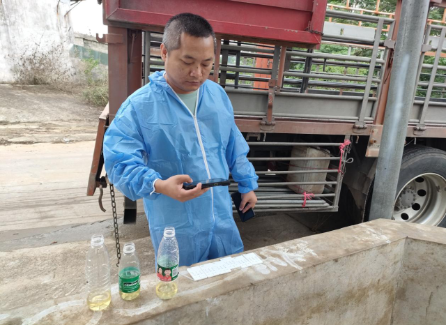 為解決養(yǎng)殖場(chǎng)戶的跑腿問題,湛江市的官方獸醫(yī)接收到檢疫任務(wù)后,統(tǒng)一持著定制的移動(dòng)終端機(jī)到養(yǎng)殖場(chǎng)實(shí)施現(xiàn)場(chǎng)檢疫。檢疫現(xiàn)場(chǎng),查看養(yǎng)殖檔案、瘦肉精抽檢、查驗(yàn)運(yùn)輸車輛備案情況、查驗(yàn)生豬的畜禽標(biāo)識(shí)佩戴情況、臨床檢查,一系列檢疫程序,官方獸醫(yī)利用移動(dòng)終端機(jī)一一記錄,并現(xiàn)場(chǎng)拍照取證、錄入畜禽標(biāo)識(shí)編號(hào)。檢疫合格后養(yǎng)殖場(chǎng)會(huì)收到微信公眾號(hào)發(fā)送的6位數(shù)字檢疫證明提取碼。