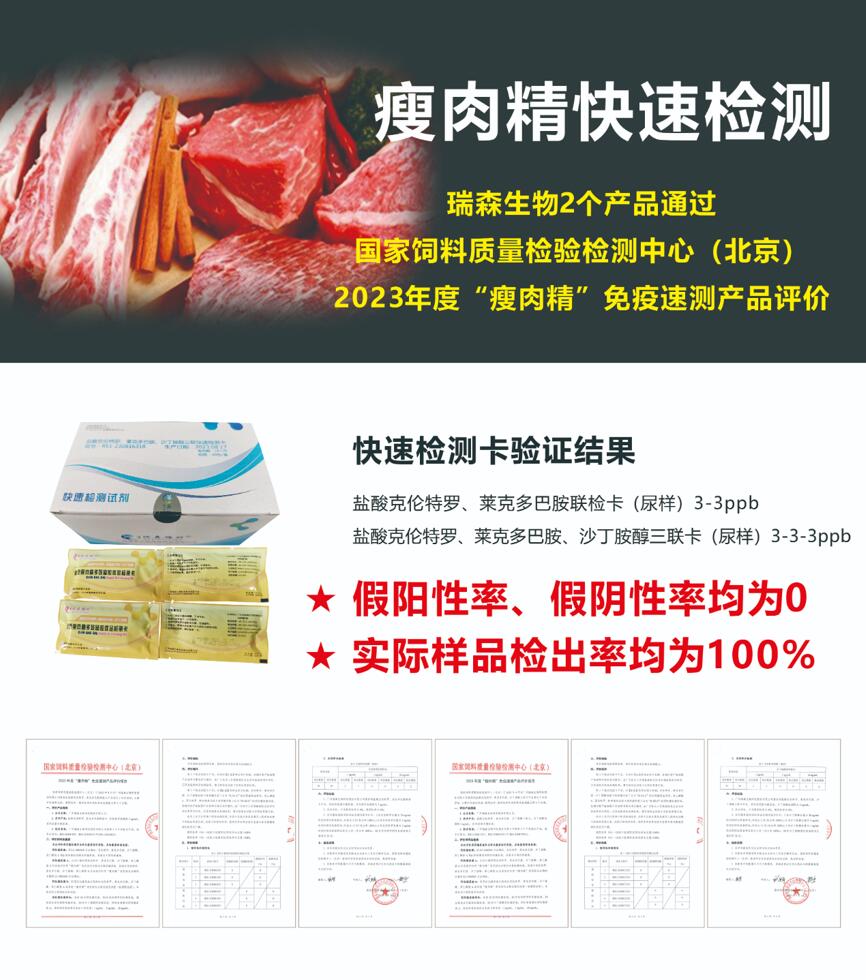 依據(jù)評(píng)價(jià)指標(biāo),瑞森生物“鹽酸克倫特羅、萊克多巴胺聯(lián)檢卡”(尿樣 3-3 ppb)、“鹽酸克倫特羅、萊克多巴胺、沙丁胺醇三聯(lián)卡”(尿樣3-3-3)2種快速檢測卡的假陽性率、假陰性率均為0,實(shí)際樣品檢出率均為100%。